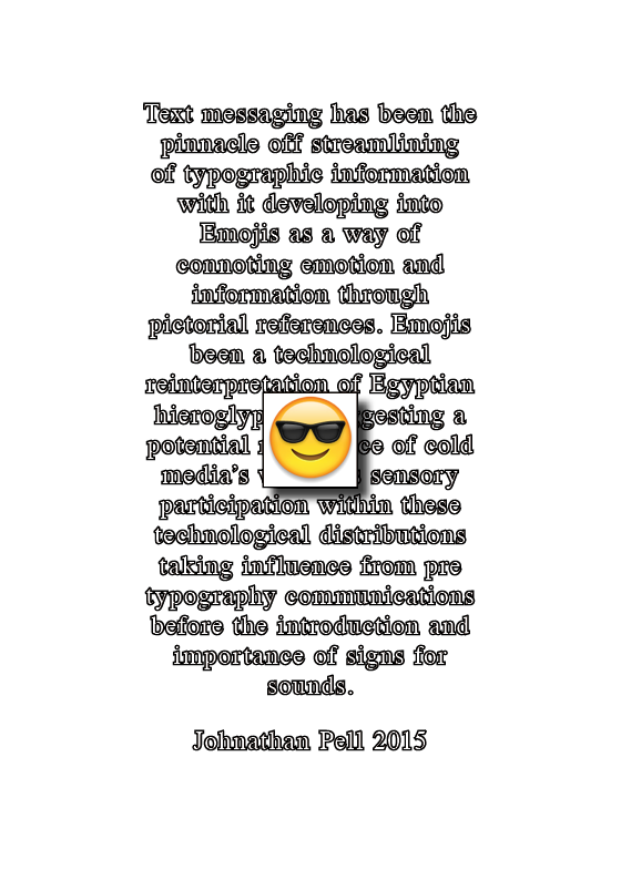 Tongue in cheek addition to add context to a theory I came up with relating to the development of language refining down to pictorial elements that are digitally repurposed hieroglyphics. Something that was pre-typographic.